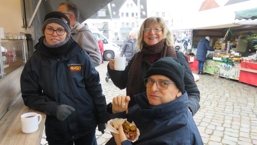Dort angekommen, konnten wir mit unserem Wünschewagen direkt auf dem Marktplatz parken und zum ersten Ziel spazieren: dem Wochenmarkt. Herr R. wollte sich unbedingt sein Lieblingsbrot vom Bäcker mitnehmen und seiner Frau einen Blumenstrauß schenken. Außerdem gab es den ersten Glühwein in diesem Winter mit einer leckeren Currywurst für unseren Fahrgast. Kurzerhand gingen wir danach in die angrenzende Kirche, unterhielten uns nett für einige Zeit mit der Pastorin und konnten uns zudem von der Kälte ein wenig in der Kirche aufwärmen.